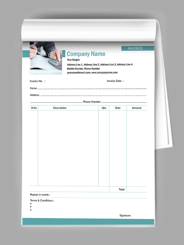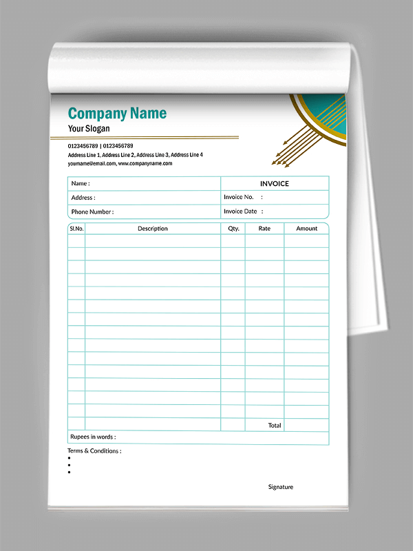 • Custom Designed Bill Books: Fully branded invoice books with company logo, GST details, and personalized layout – custom bill book printing.